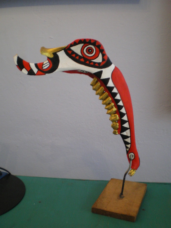 Bei den Recycling-Objekten war es ähnlich: da hat man einen Eierkarton in der Hand und sieht plötzlich, dass da Mauseköpfe mit Riesenohren drinstecken....oder ein Putzlappen ist einfach zu schön, um beim Putzen dreckig zu werden....die Spülbürste sieht aus wie ein Kranichschopf....die Verpackungspappe hat eine eigenartige Form......Wenn ich gerade in der richtigen Stimmung bin, dann kann Alles Alles sein bzw. werden. Und so ergab sich aus den beiden schon existierenden Sparten „Knochen“ und „Recycling- Objekte“ ein neues Thema: die „Wilden Kreaturen“ Sozusagen Wolpertinger der Neuzeit! Bei denen sich zusammenfindet, was nichts miteinander zu tun hat und so etwas Neues bildet. Was zum Nachdenken anregen kann, aber nicht muss....es soll in erster Linie Spaß machen. Suchen und Finden von Bestandteilen, die völlig aus ihrem Zusammenhang gerissen sind und in ihrer neuen Erscheinung (k)einen Sinn ergeben.